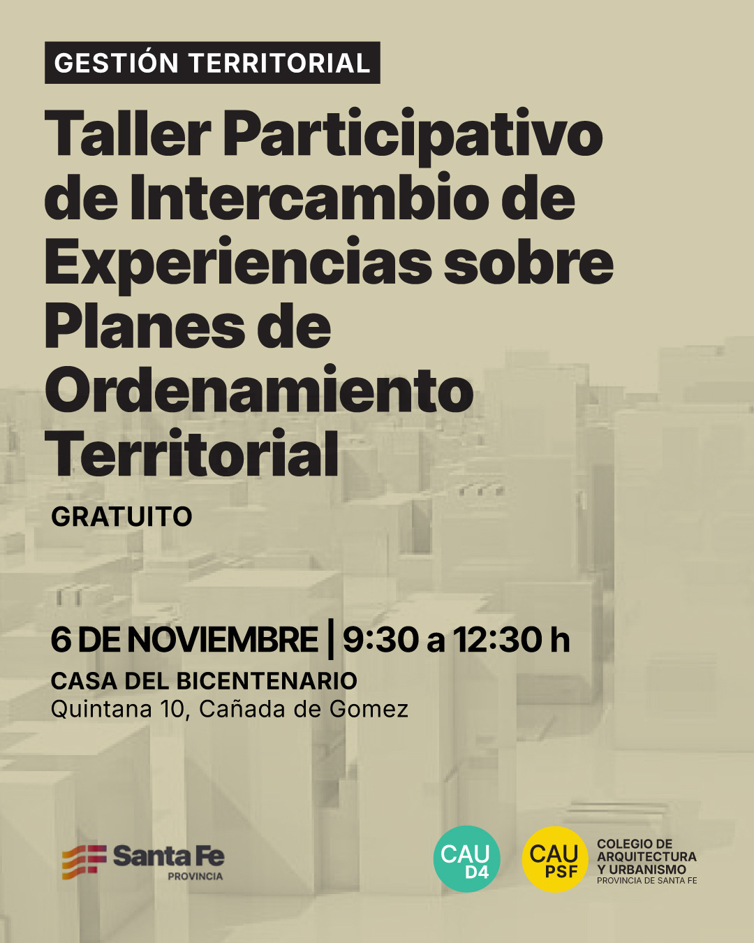 El próximo 6 de noviembre, de 9:30 a 12:30hs, se llevará a cabo en la Casa del Bicentenario (Quintana 10, Cañada de Gómez) un taller de reflexión e intercambio sobre los planes de Ordenamiento Territorial desarrollados en distintas comunidades de la provincia.